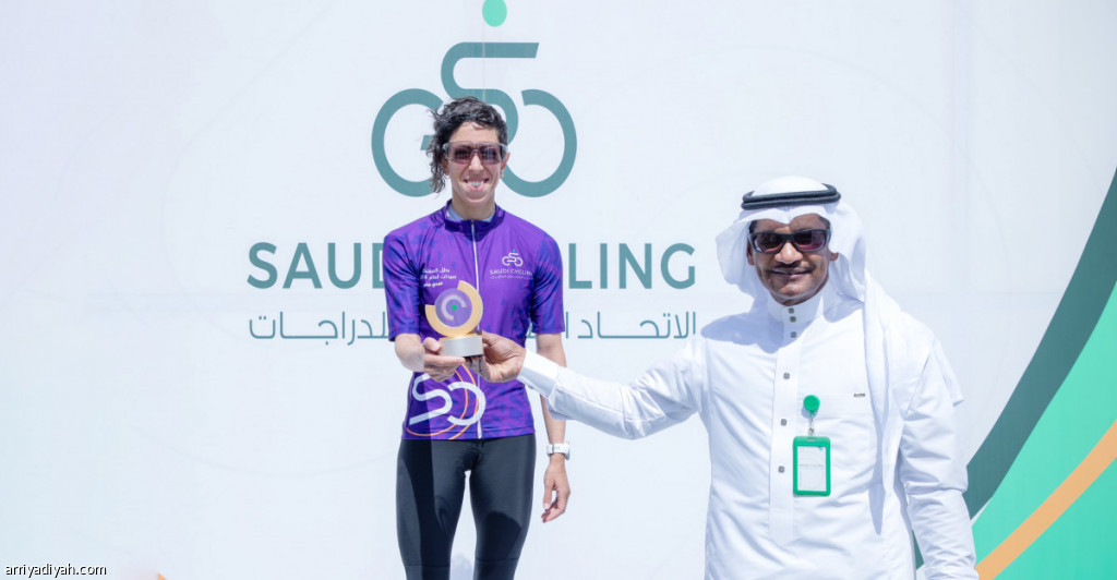 عبد الله الوثلان، رئيس الاتحاد السعودي للدراجات، أثناء تتويجه صبا الجريفان، لاعبة فريق الشباب، بكأس سباق فئة فردي عام (المركز الإعلامي ـ اتحاد الدراجات)