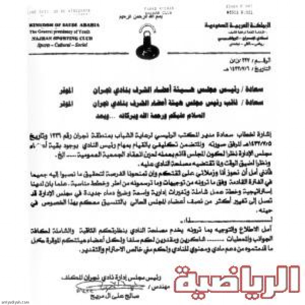 قدم نائب رئيس نادي نجران السابق المهندس صالح آل مريح خطابا إلى رئيس هيئة أعضاء الشرف عوض قريعة و نائبه صالح السيد يطلب فيه إعطاءه و زملاءه الموجودين من الإدارة السابقة فرصة في الفترة المقبلة واستمراره رئيسا للنادي بعد الخطاب الذي تلقاه من مدير مكتب رعاية الشباب بتكليفه رئيسا للنادي حتى موعد عقد الجمعية العمومية وقال : نظرا لضيق الوقت ولما تقتضيه مصلحة النادي، عليه آمل أن أحوز أنا وزملائي على ثقتكم وأن تمنحونا الفرصة لتحقيق ما نصبو إليه جميعا في الفترة المقبلة وفق ما ترونه من توجيهات وما ترسمونه من خطط مناسبة علما بأن لدينا استراتيجية وخطة عمل شاملة وتغييرات إدارية واسعة وضخ دماء جديدة في مجلس الإدارة قد تصل إلى تغيير أكثر من نصف أعضاء المجلس الحالي بالتنسيق معكم في هذا الخصوص في حينه لذا آمل الإطلاع و التوجيه بما ترونه يخدم مصلحة النادي بنظرتكم الثاقبة والشاملة لكافة الجوانب والمعطيات، شاكرين ومقدرين لكم سلفا ولكل أعضاء هيئتكم الموقرة كل ما تقدمونه من دعم مالي ومعنوي للنادي ولكم مني خالص الاحترام و التقدير.