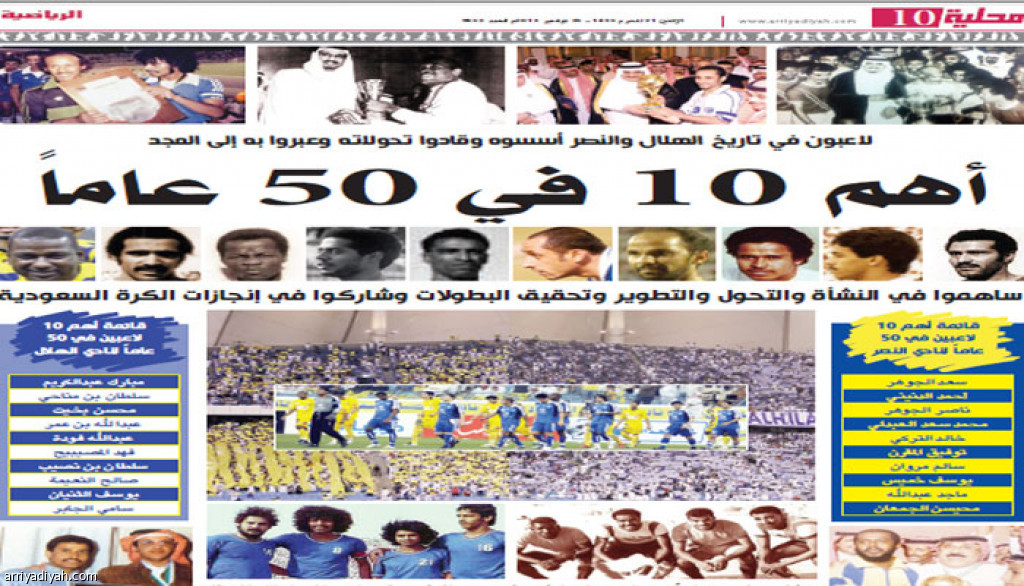 اختارت صحيفة الرياضية أهم عشرة لاعبين في تاريخ النصر والهلال ،اعتبرتهم الصحيفة في تقرير نشر يوم الاثنين الموافق 25-11-2013 على صفحة كاملة (10) ، أن ساهموا في تأسيسه ونشأته وتحوله وحصوله على البطولات والمساهمة مع المنتخبات الوطنية في تحقيق الإنجازات ، وقالت الصحيفة في التقرير " أكثر من خمسين عاماً مرت على تأسيس ناديي النصر والهلال ولم يخب نجمهما ولم يتوقفا عن صناعة وتصدير النجوم والحصول على البطولات" ، واضافت " عشرة لاعبين اختارتهم (الرياضية) من كل فريق كأهم عشرة في تاريخ النصر والهلال ساهموا في تأسيسه ونشأته وتحوله وحصوله على البطولات والمساهمة مع المنتخبات الوطنية في تحقيق الإنجازات".