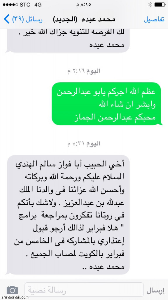 وحصلت "الرياضية" على صورة من الرسالة التي بعثها محمد عبده إلى رئيس شركة روتانا للصوتيات سالم الهندي والتي أكد فيها اعتذاره عن المشاركة في المهرجان بسبب المصاب الجلل بوفاة الملك عبدالله بن عبدالعزيز (رحمه الله).