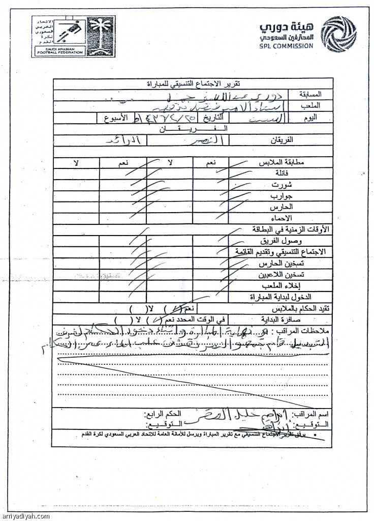 يكشف تقرير حصلت “ الرياضية” ـ على نسخة منه ـ ما دوّنه مراقب مباراة الفريق الأول لكرة القدم بنادي النصر ونظيره الرائد والذي جاء فيه ـ حرفياً ـ أن : “ في نهاية المباراة وأثناء دخول الحكام لغرف التبديل قام جمهور النصر بقذف علب الماء على الحكام “، والذي رفعه مراقب مباراة الفريقين إبراهيم الصقر للأمانة العامة بالاتحاد السعودي لكرة القدم، في المباراة التي أقيمت السبت الماضي على ملعب الأمير فيصل بن فهد، ضمن الجولة الخامسة عشرة من دوري عبداللطيف جميل.