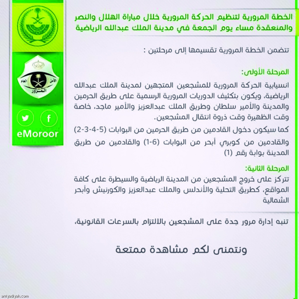 وشمل القسم الثاني التركيز على خروج المشجعين من المدينة الرياضية، بالسيطرة على كافة المواقع كطريق التحلية والأندلس والملك عبد العزيز والكورنيش وأبحر الشمالية، حيث شددت على ضرورة الالتزام بالسرعة المحددة.