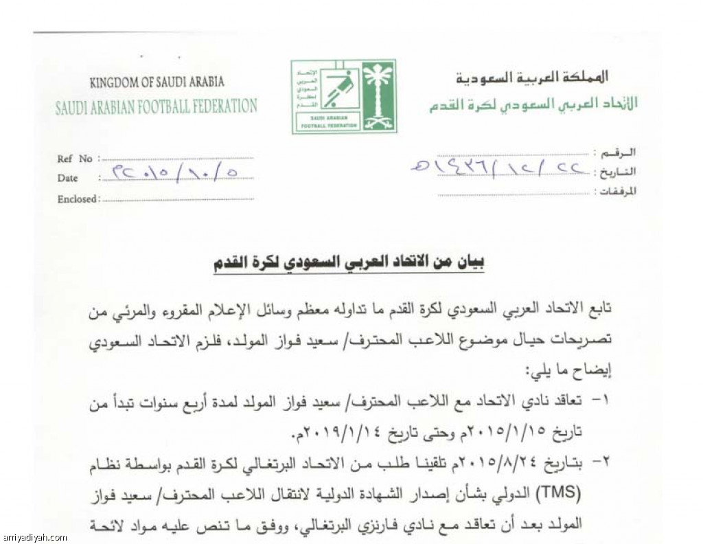 2 ـ بتاريخ 24ـ8ـ2015م تلقينا طلب من الاتحاد البرتغالي لكرة القدم بواسطة نظام (TMS) الدولي بشأن إصدار الشهادة الدولية لانتقال اللاعب المحترف سعيد فواز المولد بعد أن تعاقد مع نادي فارنزي البرتغالي، ووفق ما تنص عليه مواد لائحة أوضاع وانتقالات اللاعبين الدولية تم إبلاغ نادي الاتحاد بهذا الطلب بموجب خطاب رقم (10545/ 24) وتاريخ 10ـ11ـ1436هـ الموافق 25ـ8ـ2015م للإفادة بمرئياته في موعد أقصاه 28ـ8ـ2015م.