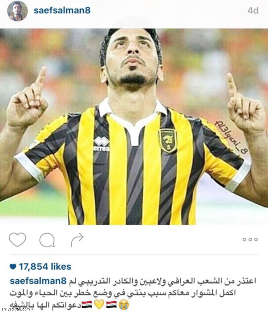 وجه اللاعب العراقي الذي سبق وان خاض تجربة احترافيه في ناديي الاتحاد و هجر السعوديين صفعه لاتحاد بلاده الذي أصدر قراراً مؤخراً بحرمان اللاعب من تمثيل المنتخبات الوطنيه بعد أن إعتذر للكادر التدريبي وزملائه اللاعبين عن عدم قدرته على إكمال المشاركه مع منتخب بلاده الاولمبي ( العراق ) المشارك في بطولة أمم آسيا تحت 23 عام والمقامه في قطر بسبب تواجد إبنته في المستشفى في وضع خطر بين الحياء و الموت - على حد تعبيره- مطالباً الجميع بالدعاء لها.