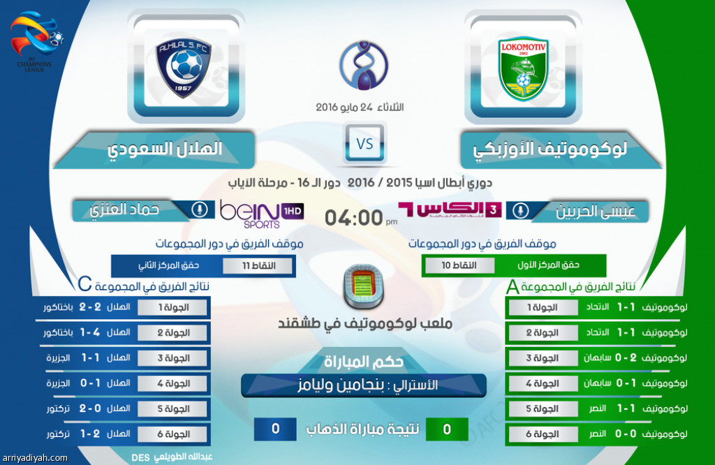 تتجه أنظار جماهير الكرة السعودية عامة، والهلالية خاصة عصر اليوم إلى ملعب بونيودكور في العاصمة الأوزبكية طشقند، عندما يحل الفريق الأول لكرة القدم بنادي الهلال ضيفاً على نظيره لوكوموتيف الأوزبكي، عند الساعة 4:00 عصراً بتوقيت السعودية، 6:00 مساءً بتوقيت أوزبكستان، في إياب دور الـ 16 من دوري أبطال آسيا.