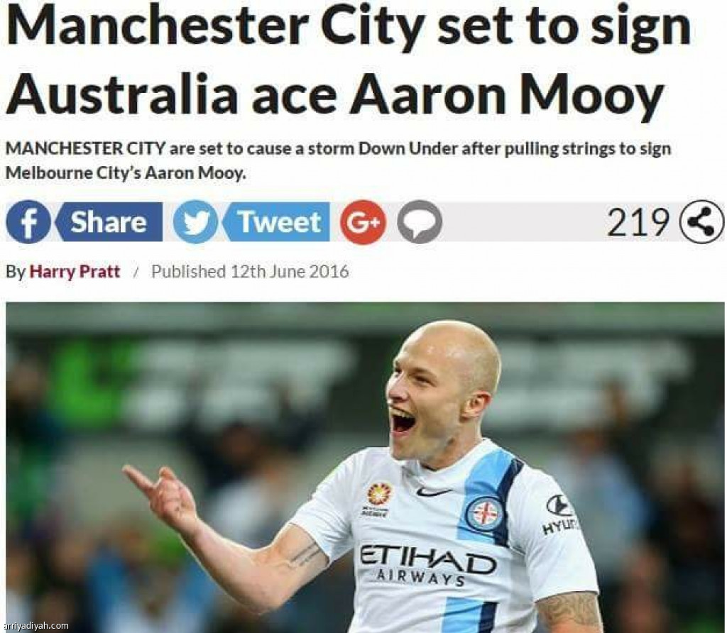 كشفت تقارير صحفية انجليزية وهولندية عن أن اللاعب الدولي الأسترالي آرون موي قد وقّع رسمياً لصالح مانشستر سيتي بيد أن النادي الإنجليزي سيعير اللاعب مدة عام لأحد الأندية الأوروبية حتى يتأقلم اللاعب على أجواء الكرة هناك قبل ارتداء قميص الفريق الانجليزي الكبير .
