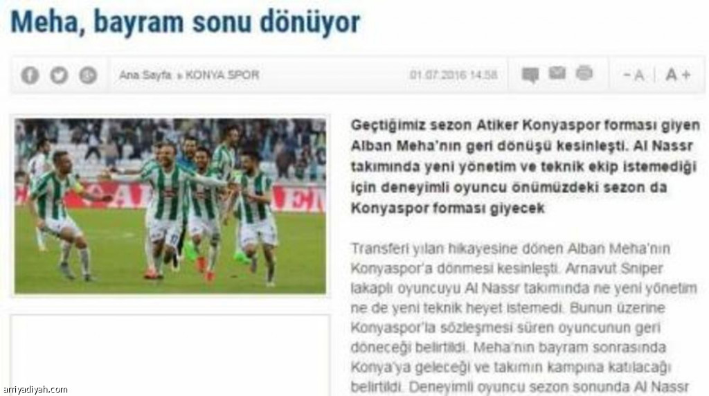 قالت تقارير صحفية تركية أن اللاعب الألباني ألبان ميها سيعود لفريقه السابق كونيا سبور التركي بعد أن باتت مسألة انتقاله لنادي النصر محل شك كبير بحسب ما نقلت صحيفة "memleket" التي قالت أن مدرب الفريق التركي اتصل باللاعب لأجل التحدث معه لعودته لصفوف الفريق من جديد .