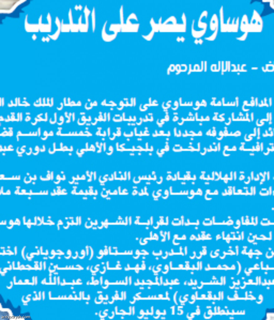أصر المدافع أسامة هوساوي على التوجه من مطار الملك خالد الدولي بالرياض إلى المشاركة مباشرة في تدريبات الفريق الأول لكرة القدم بنادي الهلال العائد إلى صفوفه مجددا بعد غياب قرابة خمسة مواسم قضاها بين تجربة احترافية مع اندرلخت في بلجيكا والأهلي بطل دوري عبداللطيف جميل.