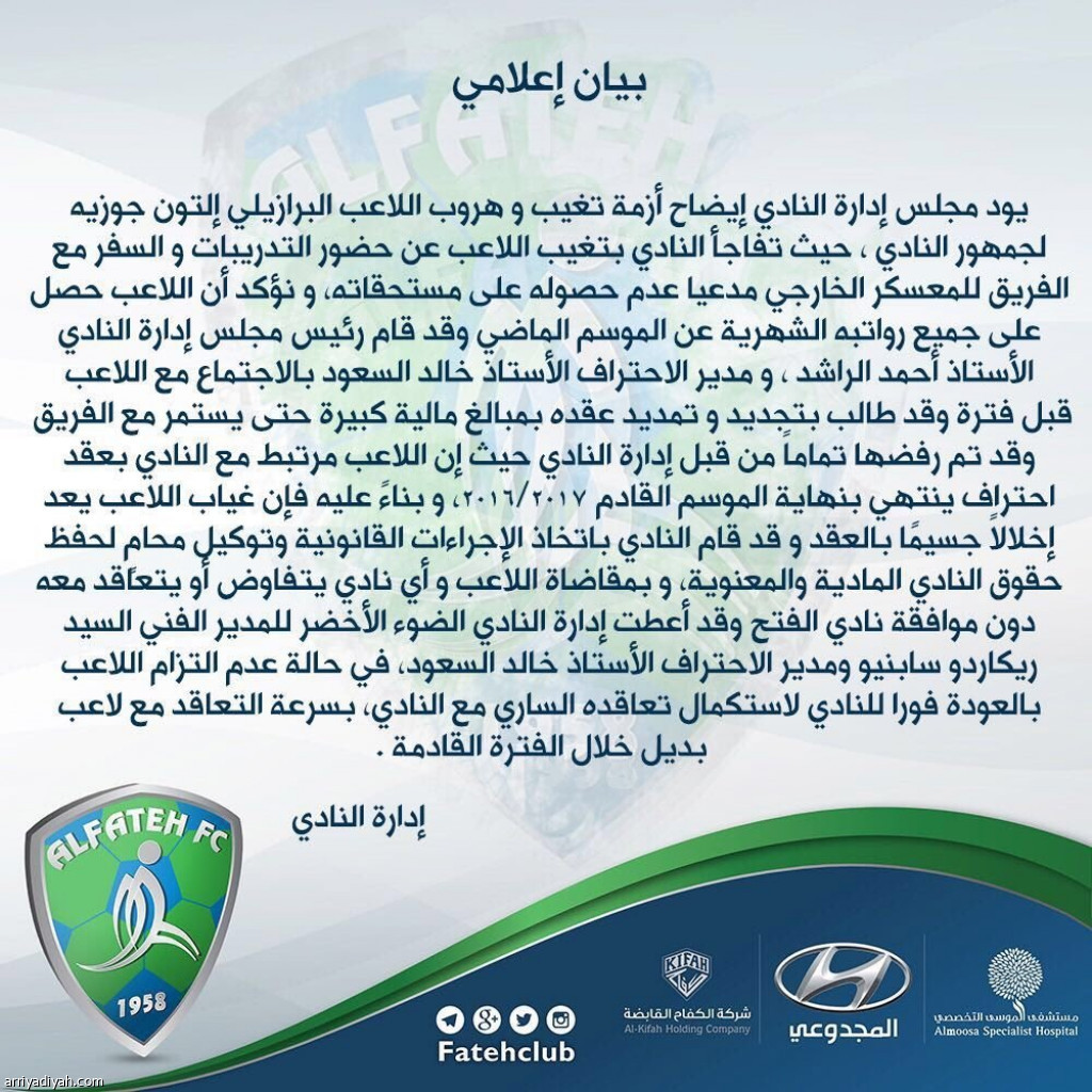 ووصفت ادارة الفتح تصرف اللاعب من خلال البيان الذي وجهته لجماهير النادي بالهروب وانها تفاجأت بتغيب اللاعب عن التدريبات والسفر مع الفريق للمعسكر الخارجي مدعياًَ عدم حصوله على مستحقاته مؤكدة حصوله على جميع رواتبه عن الموسم الماضي .