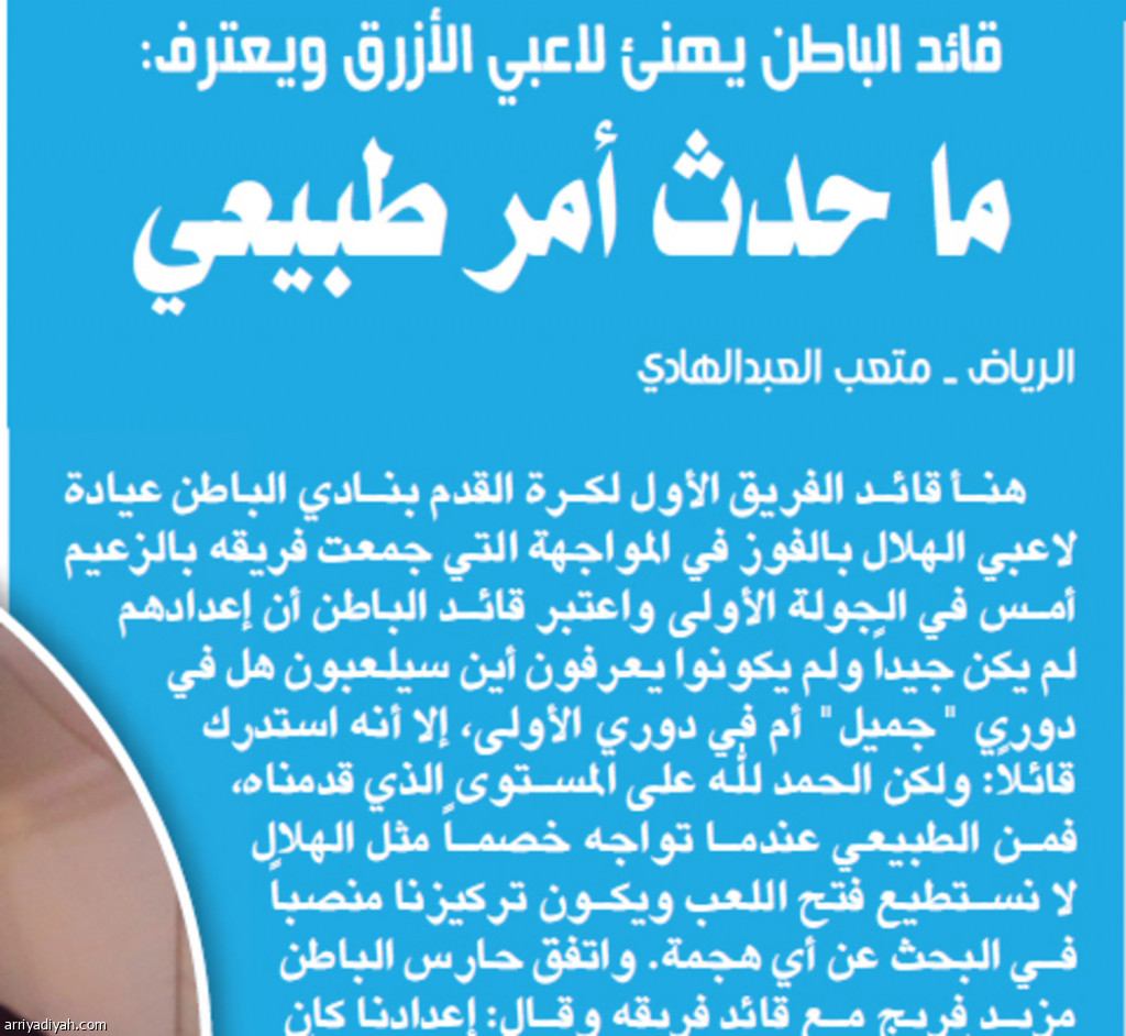 هنأ قائد الفريق الأول لكرة القدم بنادي الباطن عيادة لاعبي الهلال بالفوز في المواجهة التي جمعت فريقه بالزعيم أمس في الجولة الأولى واعتبر قائد الباطن أن إعدادهم لم يكن جيداً ولم يكونوا يعرفون أين سيلعبون هل في دوري "جميل" أم في دوري الأولى، إلا أنه استدرك قائلاً: ولكن الحمد لله على المستوى الذي قدمناه، فمن الطبيعي عندما تواجه خصماً مثل الهلال لا نستطيع فتح اللعب ويكون تركيزنا منصباً في البحث عن أي هجمة. واتفق حارس الباطن مزيد فريج مع قائد فريقه وقال: إعدادنا كان متأخراً والهلال فريق كبير وفريقنا ليس سهلاً. وزاد: مستوانا كان جيداً وسنثبت للجميع في المستقبل من هو الباطن.
