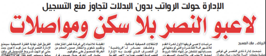 نجحت إدارة نادي النصر في توفير مبلغ يتجاوز الـ3 ملايين ريال بعد أن استبعدت بدل السكن والمواصلات من مرتبات لاعبي فريقها الأول لكرة القدم للأشهر الـ9 المتأخرة والتي أودعتها في حساباتهم لتتمكن من إنهاء كافة شروط لجنة الاحتراف بالاتحاد السعودي لكرة القدم وقيد لاعبيها الجدد في فترة الانتقالات الصيفية الحالية.