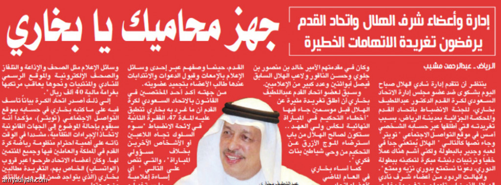 ينتظر أن تتقدم إدارة نادي الهلال صباح اليوم بشكوى ضد عضو مجلس إدارة الاتحاد السعودي لكرة القدم الدكتور عبداللطيف بخاري، للجنة الانضباط باتحاد القدم والمحكمة الجزائية بمدينة الرياض، بسبب تغريدته التي أطلقها عبر حسابه الشخصي أمس في موقع التواصل الاجتماعي "تويتر" وجاء نصها كالتالي " الهلال يُمتعني جدا في لعبه وجدير بالبطولة ولكني أشم هناك عملاً خفياً وترتيبات دنيئة مبكرة لتمكينه ببطولة الدوري، دعونا نستمتع بدوري نزيه وممتع".