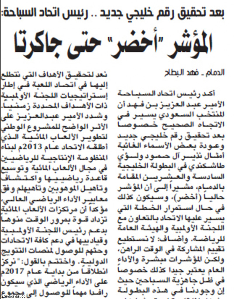 أكد رئيس اتحاد السبـاحـة الأمير عبد العزيز بن فـهد أن المنتخب السعودي يسيـر في الاتجاه الصحيح خـصـوصاً بعد تحقيق رقم خليجي جديـد وعودة بعض الأسماء الغائبة أمثال نذيـر آل حـمود ولـؤي طاشكندي في البطولة الخليجية السادسة والعـشريــن المقـامة بالدمام، مشيراً إلى أن المؤشر حالياً (أخضر)، وسيكون كذلك في حال استمرار الخـطة التي يسير عليها الاتحاد بالتعاون مع اللجنة الأولمبية والهيئة العامة للرياضة. وأضاف: لا نستطيع تقييم المشاركة في الوقت الراهن، ولكن المؤشرات مبشرة والأداء العام يعتبر جيدا كذلك خصوصاً في ظل جاهزية السباحين حيث إن وجودنا في هذه البطـولة يشكل لنا قاعدة لعدة مشاركات دولية قادمة بداية من بطولة دبي ووصولاً إلى بطولة جاكرتا التي ستقام بعد 24 شهراً على وجه التحديد وهي المشاركة التي نعد لتحقيق الأهداف التي نتطلع إليها في اتحاد اللعبة في إطار إستراتيجيات اللجنة الأولمبـية ذات الأهـداف المحددة زمـنـياً. وشدد الأمير عبـدالعـزيز على الأثر الواضح للمشروع الوطني لتطوير الألعاب المائـية الذي أطلقه الاتحاد عام 2013م لبناء المنظومة الإنتاجية للرياضيين في مجال الألعاب المائية وتوسيع قاعدة رياضيـيـها واكـتـشاف وتأهيل الموهوبين وتأهيهلم وفق معايير الأداء الرياضي العالي، مؤكداً أن مرتكزات الألعاب المائية تزداد قوة بمرور الوقت منوهـاً بدعم رئيس اللجنة الأولمـبـية وقيادييها في دعم كافة الاتحادات وحثهم للوصول لمنصات التتويج الدولية. واختتم بالقول:"نركز انطلاقاً من بداية عام 2017م على الأداء الرياضي الذي سيكون رافدا مهماً للوصول إلى مجموع ميداليات مميز في عام 2022م مروراً بجاكرتا 2018م وكلنا ثقة بلاعبينا وأطقمنا الفنية والإدارية والدعم المتواصل من اللجنة الأولمبية".