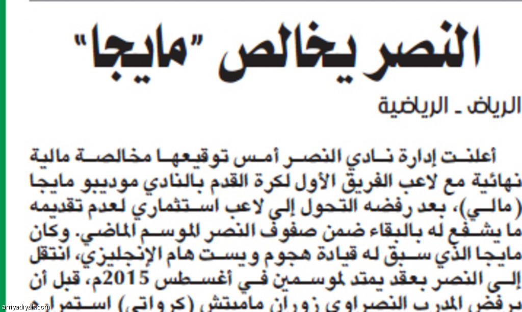 أعلنت إدارة نادي النصر أمس توقيعها مخالصة مالية نهائية مع لاعب الفريق الأول لكرة القدم بالنادي موديبو مايجا (مالي)، بعد رفضه التحول إلى لاعب استثماري لعدم تقديمه ما يشفع له بالبقاء ضمن صفوف النصر الموسم الماضي. وكان مايجا الذي سبق له قيادة هجوم ويست هام الإنجليزي، انتقل إلى النصر بعقد يمتد لموسمين في أغسطس 2015م، قبل أن يرفض المدرب النصراوي زوران ماميتش (كرواتي) استمراره مع الفريق لعدم قناعته بمستويات اللاعب.