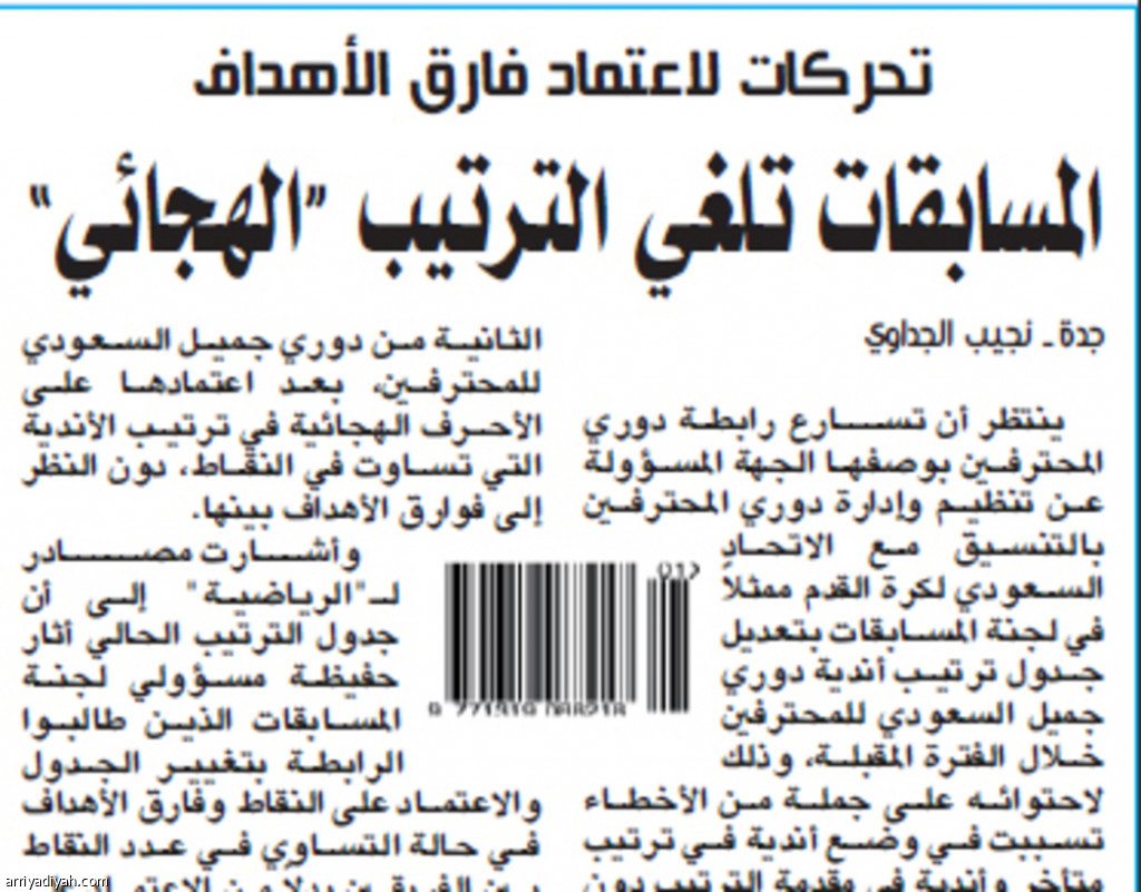 ينتظر أن تســـارع رابطـة دوري المحترفين بوصفها الجهة المسؤولة عن تنظيم وإدارة دوري المحترفين بالتنسيق مع الاتحاد السعودي لكرة القدم ممثلاً في لجنة المسابقات بتعديل جدول ترتيب أندية دوري جميل السعودي للمحترفين خلال الفترة المقبلة، وذلك لاحتوائه على جملة من الأخطاء تسببت في وضع أندية في ترتيب متأخر وأندية في مقدمة الترتيب دون وجه حق، وذلك حتى ما بعد الجولة الثانية من دوري جميل السعودي للمحترفين، بعد اعتمادها على الأحرف الهجائية في ترتيب الأندية التي تساوت في النقاط، دون النظر إلى فوارق الأهداف بينها.