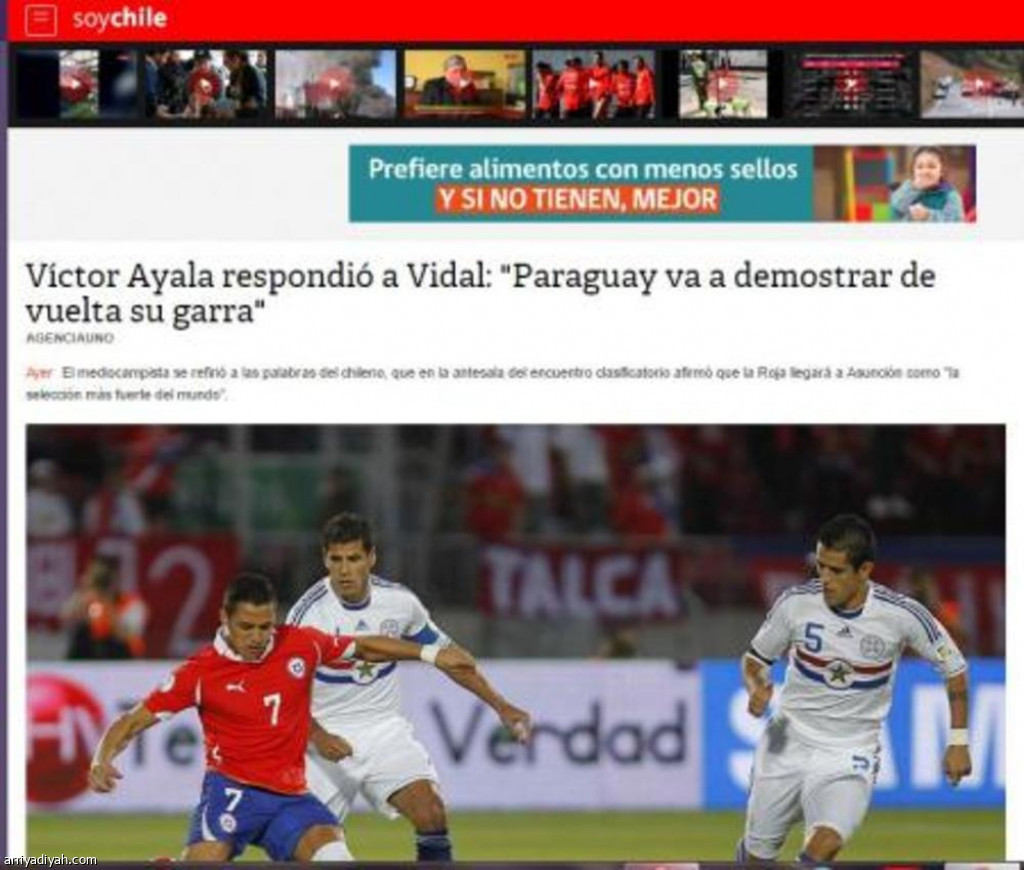 رد لاعب الفريق الأول لكرة القدم بنادي النصر ولاعب منتخب البارجواي فيكتور إيالا بعنف على تهديدات المهاجم التشيلي ارتورو فيدال بعزم بلاده غزو البارجواي وذلك حينما يصطدم الفريقان غدا الجمعة ضمن تصفيات أمريكا الجنوبية لكأس العالم 2018 قائلا: تعالوا.