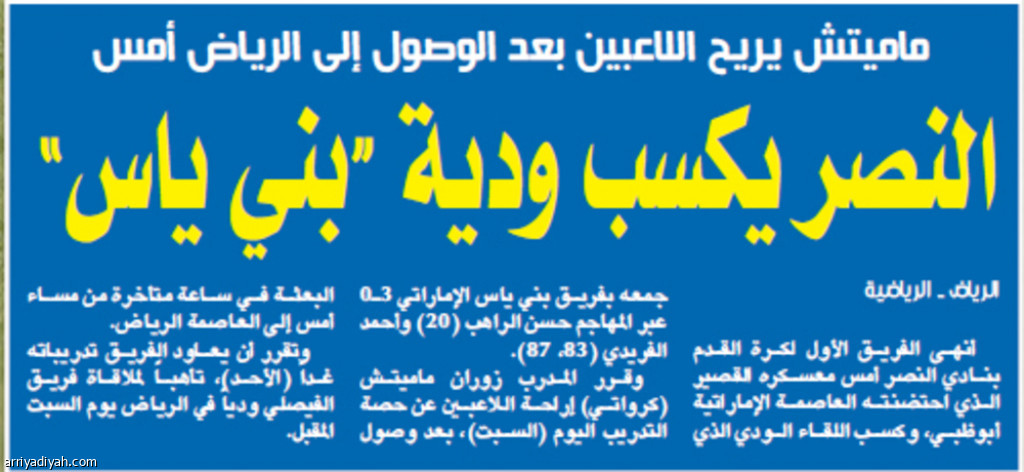 أنهى الفريق الأول لكرة القدم بنادي النصر أمس معسكره القصير الذي احتضنته العاصمة الإماراتية أبوظبي، وكسب اللقاء الودي الذي جمعه بفريق بني ياس الإماراتي 3ـ0 عبر المهاجم حسن الراهب (20) وأحمد الفريدي (83، 87).