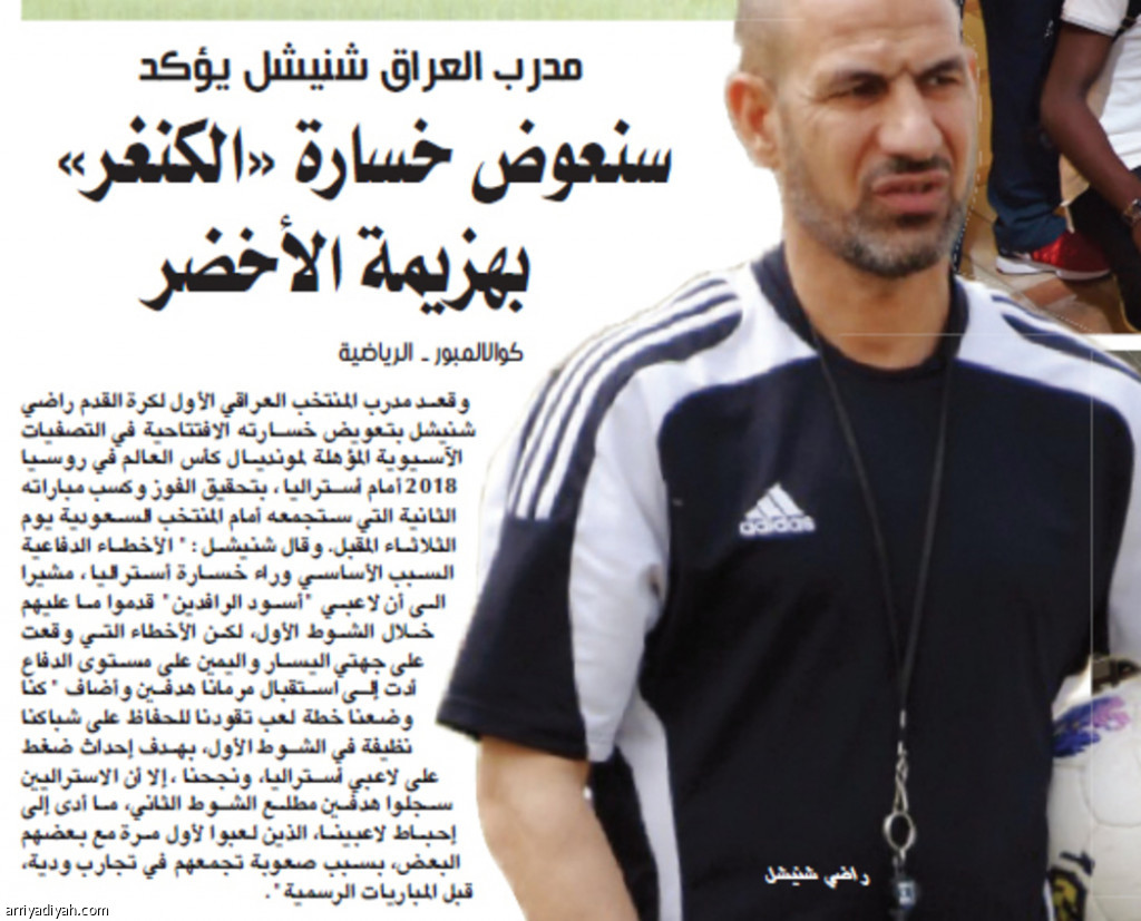 وعد مدرب المنتخب العراقي الأول لكرة القدم راضي شنيشل بتعويض خسارته الافتتاحية في التصفيات الآسيوية المؤهلة لمونديال كأس العالم في روسيا 2018 أمام أستراليا ، بتحقيق الفوز وكسب مباراته الثانية التي ستجمعه أمام المنتخب السعودية يوم الثلاثاء المقبل. وقال شنيشل :" الأخطاء الدفاعية السبب الأساسي وراء خسارة أستراليا ، مشيرا الى أن لاعبي "أسود الرافدين" قدموا ما عليهم خلال الشوط الأول، لكن الأخطاء التي وقعت على جهتي اليسار واليمين على مستوى الدفاع أدت إلى استقبال مرمانا هدفين وأضاف "كنا وضعنا خطة لعب تقودنا للحفاظ على شباكنا نظيفة في الشوط الأول، بهدف إحداث ضغط على لاعبي أستراليا، ونجحنا ، إلا أن الاستراليين سجلوا هدفين مطلع الشوط الثاني، ما أدى إلى إحباط لاعبينا، الذين لعبوا لأول مرة مع بعضهم البعض، بسبب صعوبة تجمعهم في تجارب ودية، قبل المباريات الرسمية".