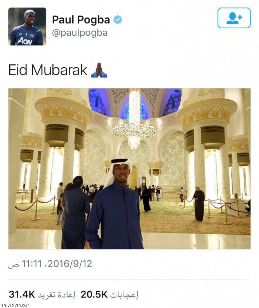 قدم لاعب مانشستر يونايتد الإنجليزي، الدولي الفرنسي بول بوجبا، عبر حسابه الرسمي على موقع التواصل الإجتماعي "تويتر" التهنئة للمسلمين بعيد الأضحى.
