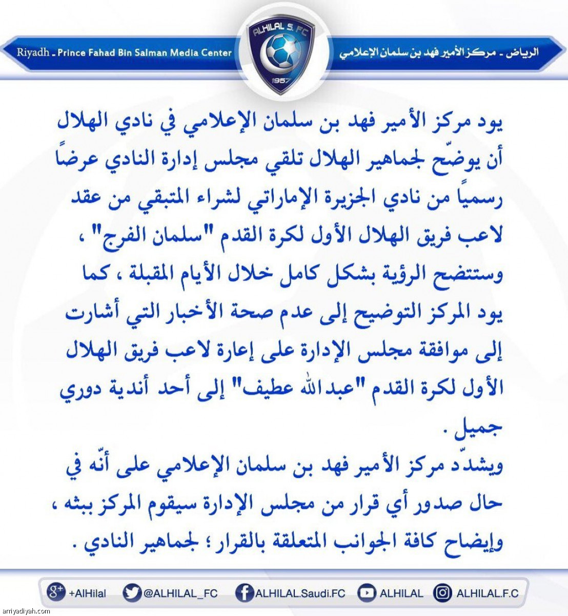 وأردف البيان :"كما يود المركز التوضيح إلى عدم صحة الأخبار التي أشارت إلى موافقة مجلس الإدارة على اعارة لاعب الفريق الهلال الأول لكرة القدم عبدالله عطيف إلى أحد أندية دوري جميل".