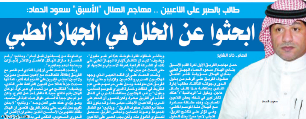 وشدد الحماد على أن النقد الكبير الذي وجهه الهلاليون للمدرب واللاعبين والإدارة وحتى إدارة الفريق كان متوقعاً، ويدل على حرصهم على عدم التفريط في النقاط وخسارة الدوري للموسم السادس، ويقول:"يرغب الهلاليون بمناقشة المدرب في الخلل القائم في الفريق مبكرا، ولكن أتصور أن الحكم على المدرب واللاعبين الأجانب مبكر جداً، وقد يكون ذلك ممكناً مع اكتمال صفوف الفريق"، ويتابع:"مع اكتمال المجموعة وعودة المصابين وتجانس الفريق، سيصل للمستوى المأمول منه، ولكن يجب الصبر على اللاعبين وعدم الاستعجال في النقد، فالهلال خسر مثلما خسر برشلونة من إسبانيول قبل أيام"، ويتابع:"رغم الخسارة مازال الهلال الأفضل والأكثر إنجازات وبحاجة لدعم جماهيره".