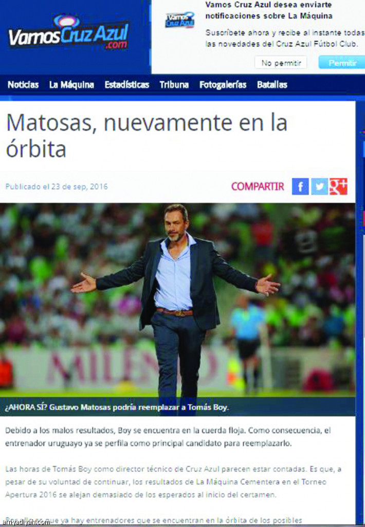 عززت وسائل إعلام أوروجويانية صادرة أمس من شكوك إدارة نادي الهلال في مدرب الفريق الأول لكرة القدم المقال جوستافو ماتوساس (أوروجوياني)، حول تعمده الإضرار بالفريق بحثاً عن صـدور قرار إبعاده ليحصـــل على الشرط الجزائي وينتقل إلى الإشراف على أحد فرق الدوري المكسيكي.