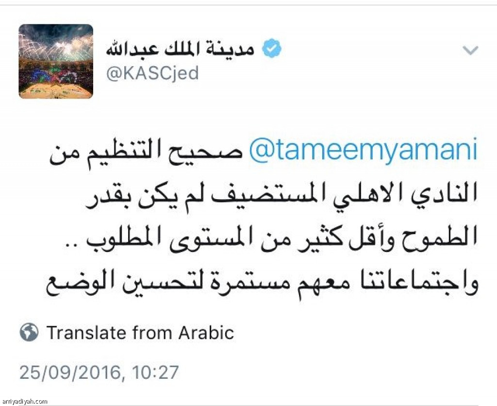 وجاء نص التغريدة التي جاءت كرد على مشجع: "التنظيم من النادي الاهلي المستضيف لم يكن بقدر الطموح واقل بكثير من المستوى المطلوب .. واجتماعاتنا معهم مستمرة لتحسين الوضع".