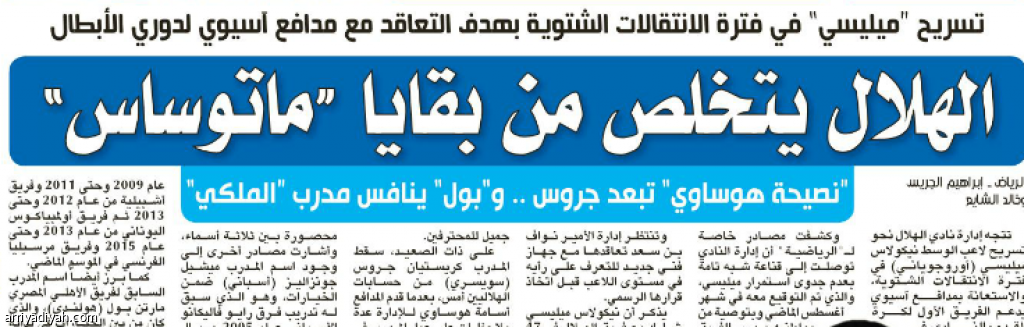 تتجه إدارة نادي الهلال نحو تسريح لاعب الوسط نيكولاس ميليسي (أوروجوياني) في فترة الانتقالات الشتوية، والاستعانة بمدافـــع آسيوي يدعم الفريق الأول لكــرة القدم بالنـــادي في بطولة دوري أبطال آسيا 2017.