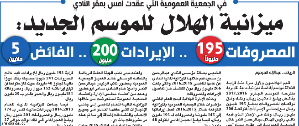 قدم الهلاليون ولأول مرة منذ قرابة الثلاثة مواسم الماضية ميزانية مالية تقديرية مقترحة للموسم الجاري ٢٠١٦ـ٢٠١٧ بفائض يبلغ 5 ملايين ريال، وذلك وفق توقعات للمصروفات بمبلغ ١٩٥ مليون ريال مع إجمالي الإيرادات المتوقعة ٢٠٠ مليون ريال، وذلك في الإعلان الذي قدمه نائب رئيس الهلال عبدالرحمن النمر خلال الجمعية العمومية التي عقدت مساء أمس الخميس بصالة مؤسس النادي عبدالرحمن بن سعيد قدم خلالها الميزانية المالية للنادي عن عامها الماضي ٢٠١٥ـ٢٠١٦ والتي بلغت ٢٦٦ مليون ريال دون الكشف عن تفاصيل الإيرادات والمصروفات.
