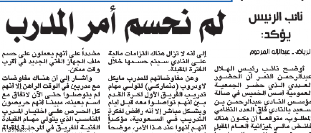 وأشار إلى أن هناك مفاوضات مع مدربين في الوقت الراهن إلا أنهم لم يتوصلوا حتى الآن لاتفاق مع اسم بعينه، مبيناً أنهم حريصون كل الحرص على اختيار المدرب المناسب الذي يتولى مهام القيادة الفنية للفريق في المرحلة المقبلة وأن هذا الملف سيحسم قريباً.