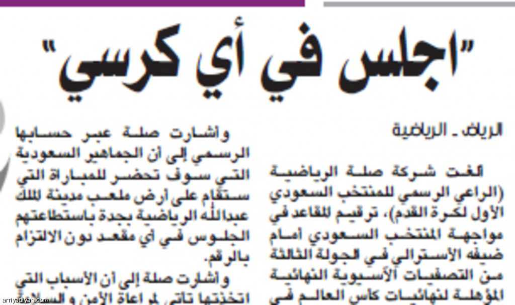 ألغت شركة صلة الرياضية (الراعي الرسمي للمنتخب السعودي الأول لكرة القدم)، ترقيم المقاعد في مواجهة المنتخب السعودي أمام ضيفه الأسترالي في الجولة الثالثة من التصفيات الآسيوية النهائية المؤهلة لنهائيات كأس العالم في روسيا 2018.