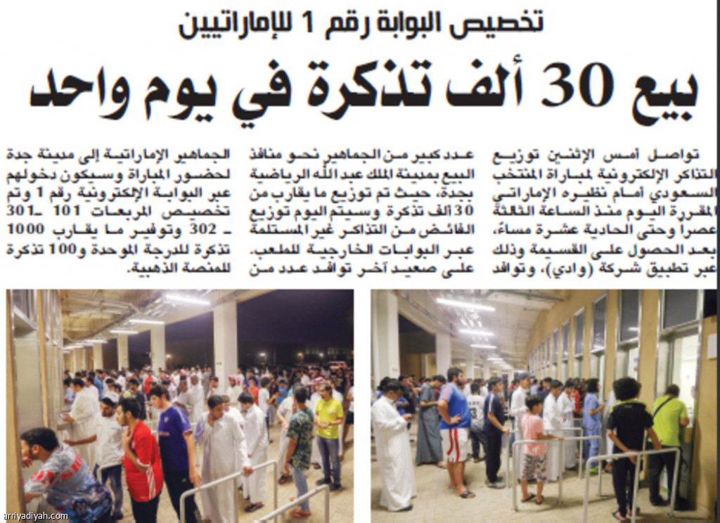 تواصل أمس الإثنين توزيع التذاكر الإلكترونية لمباراة المنتخب السعودي أمام نظيره الإماراتي المقررة اليوم منذ الساعة الثالثة عصراً وحتى الحادية عشرة مساءً، بعد الحصول على القسيمة وذلك عبر تطبيق شركة (وادي)، وتوافد عدد كبير من الجماهير نحو منافذ البيع بمدينة الملك عبد الله الرياضية بجدة، حيث تم توزيع ما يقارب من 30 ألف تذكرة وسيتم اليوم توزيع الفائض من التذاكر غير المستلمة عبر البوابات الخارجية للملعب. على صعيد آخر توافد عدد من الجماهير الإماراتية إلى مدينة جدة لحضور المباراة وسيكون دخولهم عبر البوابة الإلكترونية رقم 1 وتم تخصيص المربعات 101 ـ301 ـ 302 وتوفير ما يقارب 1000 تذكرة للدرجة الموحدة و100 تذكرة للمنصة الذهبية.