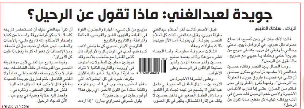 .. وما الحال بين النصر وقائده حسين عبدالغني إلا مشهد تراجيدي متكرر يستحق أن تتلى فيه قصيدة فاروق جويدة المعنونة بـ"الرحيل"، وفيها يُغرق القارئ في بحر قاتم من الحزن، حتى إذا قارب الأنفاس الأخيرة ولامس طعم الرحيل فاه، صرخ في أذنه يوقظه نهاية كل مقطع: ماذا تقول عن الرحيل؟.