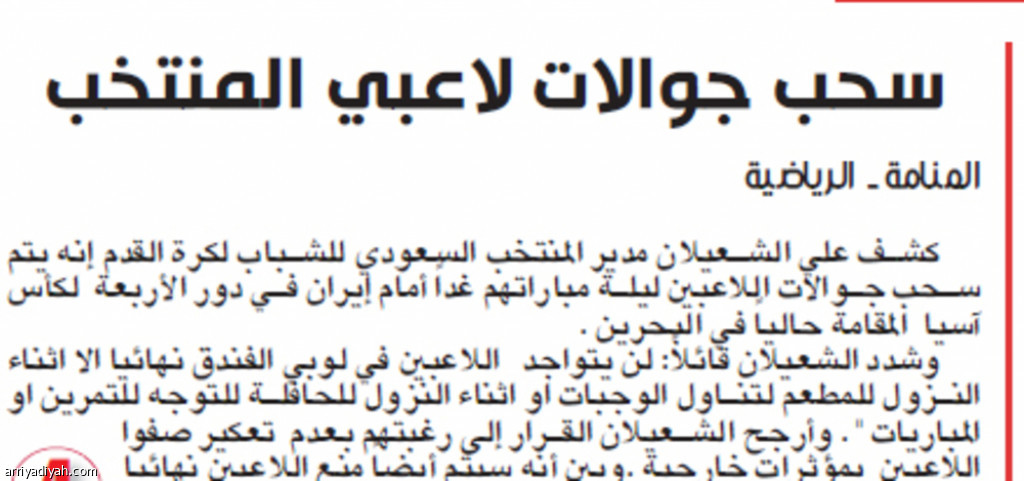 كشف علي الشعيلان مدير المنتخب السعودي للشباب لكرة القدم إنه يتم سحب جوالات اللاعبين ليلة مباراتهم غداً أمام إيران في دور الأربعة لكأس آسيا المقامة حالياً في البحرين .