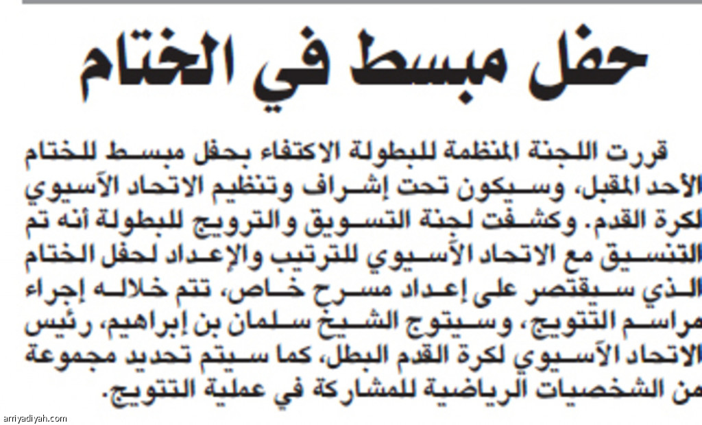 قررت اللجنة المنظمة للبطولة الاكتفاء بحفل مبسط للختام الأحد المقبل، وسيكون تحت إشراف وتنظيم الاتحاد الآسيوي لكرة القدم. وكشفت لجنة التسويق والترويج للبطولة أنه تم التنسيق مع الاتحاد الآسيوي للترتيب والإعداد لحفل الختام الذي سيقتصر على إعداد مسرح خاص، تتم خلاله إجراء مراسم التتويج، وسيتوج الشيخ سلمان بن إبراهيم، رئيس الاتحاد الآسيوي لكرة القدم البطل، كما سيتم تحديد مجموعة من الشخصيات الرياضية للمشاركة في عملية التتويج.