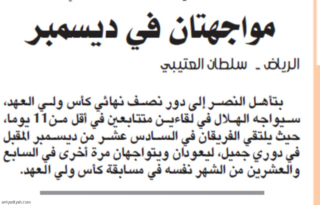 بتأهل النصر إلى دور نصف نهائي كأس ولي العهد، سيواجه الهلال في لقاءين متتابعين في أقل من11 يوما، حيث يلتقي الفريقان في السادس عشر من ديسمبر المقبل في دوري جميل، ليعودان ويتواجهان مرة أخرى في السابع والعشرين من الشهر نفسه في مسابقة كأس ولي العهد.