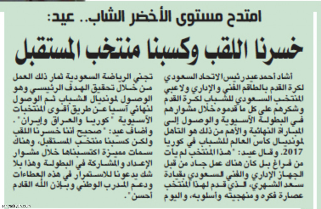 أشاد أحمد عيد رئيس الاتحاد السعودي لكرة القدم بالطاقم الفني والإداري ولاعبي المنتخب السعودي للشباب لكرة القدم وشكرهم على كل ما قدموه خلال مشوارهم في البطولة الآسيوية والوصول إلى المباراة النهائية والأهم من ذلك هو التأهل لمونديال كأس العالم للشباب في كوريا 2017. وقال عيد: "هذا المنتخب لم يأت من فراغ بل كان هناك عمل جاد من قبل الجهاز الإداري والفني السعودي بقيادة سعد الشهري، الذي قدم لهذا المنتخب عصارة فكره ومنهجيته وأسلوبه، واليوم تجني الرياضة السعودية ثمار ذلك العمل من خلال تحقيق الهدف الرئيسي وهو الوصول لمونديال الشباب ثم الوصول لنهائي آسيا عن طريق أقوى المنتخبات الآسيوية "كوريا والعراق وإيران". وأضاف عيد: "صحيح أننا خسرنا اللقب ولكن كسبنا منتخب المستقبل، وهناك سمات مميزة اكتسبناها خلال مشوار الإعداد والمشاركة في البطولة وهذا بلا شك يدعونا للاستمرار في هذه العطاءات ودعم المدرب الوطني وبإذن الله القادم أحسن".