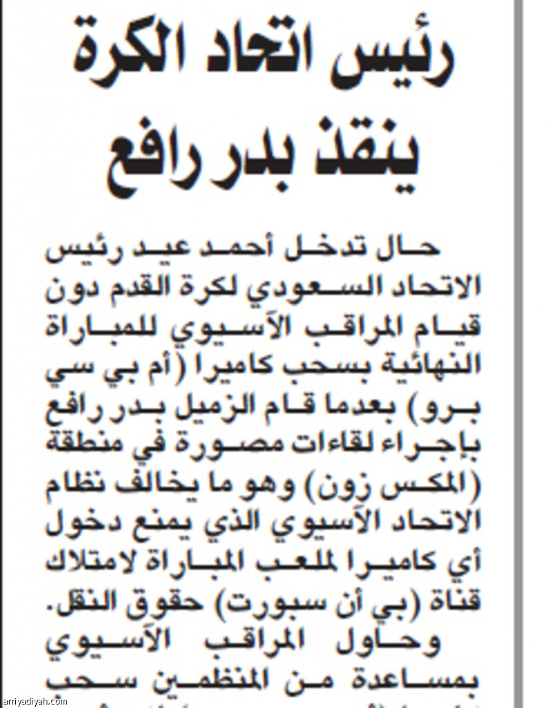حال تدخل أحمد عيد رئيس الاتحاد السعودي لكرة القدم دون قيام المراقب الآسيوي للمباراة النهائية بسحب كاميرا (أم بي سي برو) بعدما قام الزميل بدر رافع بإجراء لقاءات مصورة في منطقة (المكس زون) وهو ما يخالف نظام الاتحاد الآسيوي الذي يمنع دخول أي كاميرا لملعب المباراة لامتلاك قناة (بي أن سبورت) حقوق النقل.