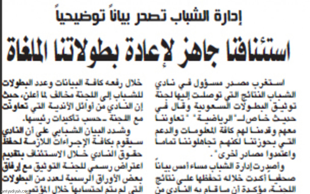 وأصدرت إدارة الشباب مساء أمس بياناً صحفياً أكدت خلاله تحفظها على نتائج اللجنة، مؤكدة أن ما قام به النادي من خلال رفعه كافة البيانات وعدد البطولات للشباب إلى اللجنة مخالف لما أعلن، حيث إن النادي من أوائل الأندية التي تعاونت مع اللجنة ـ حسب تأكيدات رئيسها.