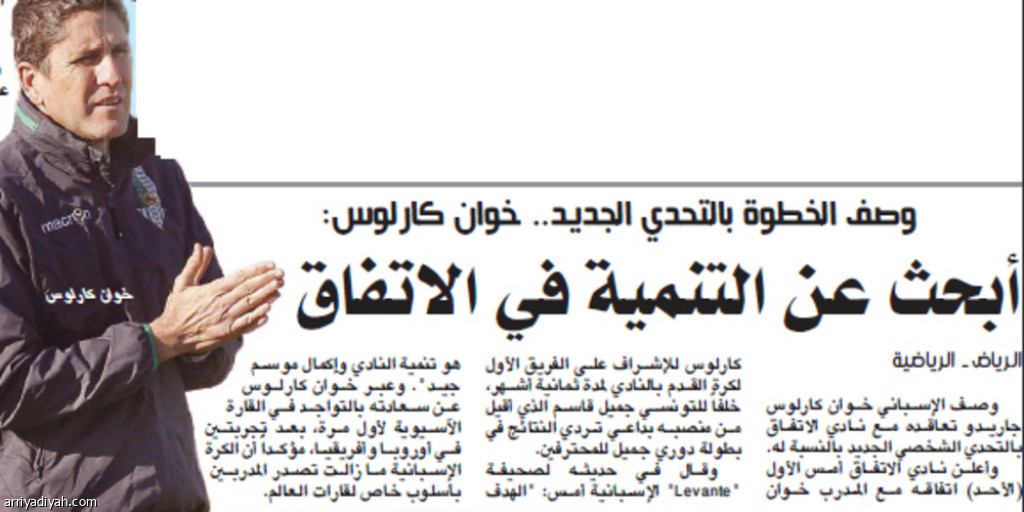 وقال في حديثه لصحيفة "Levante" الإسبانية أمس: "الهدف هو تنمية النادي وإكمال موسم جيد". وعبر خوان كارلوس عن سعادته بالتواجد في القارة الآسيوية لأول مرة، بعد تجربتين في أوروبا وأفريقيا، مؤكداً أن الكرة الإسبانية ما زالت تصدر المدربين بأسلوب خاص لقارات العالم.