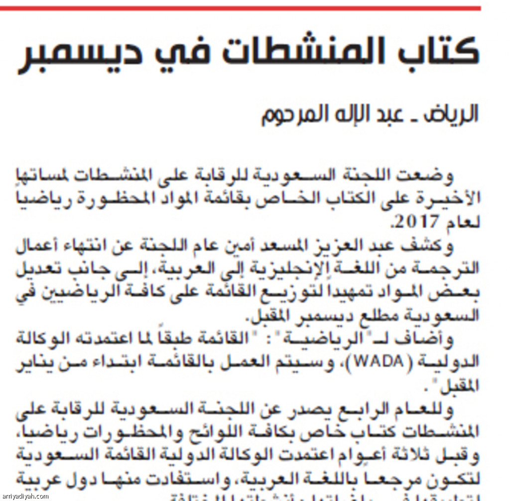 وللعام الرابع يصدر عن اللجنة السعودية للرقابة على المنشطات كتاب خاص بكافة اللوائح والمحظورات رياضياً، وقبل ثلاثة أعوام اعتمدت الوكالة الدولية القائمة السعودية لتكون مرجعاً باللغة العربية، واستفادت منها دول عربية لتطبيقها في رياضاتها وأنشطتها المختلفة.