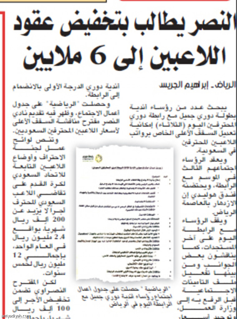 وحصلت "الرياضية" على جدول أعمال الاجتماع، وظهر فيه تقديم نادي النصر مقترح مناقشة السقف الأعلى لأسعار اللاعبين المحترفين السعوديين.