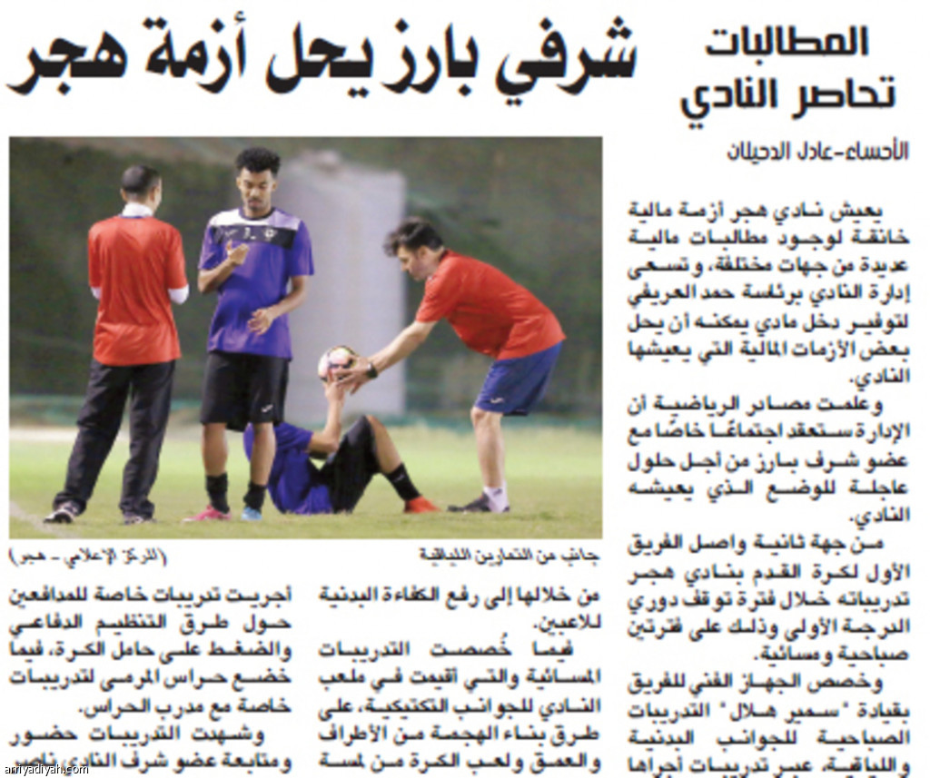 من جهة ثانية واصل الفريق الأول لكرة القدم بنادي هجر تدريباته خلال فترة توقف دوري الدرجة الأولى وذلك على فترتين صباحية ومسائية.