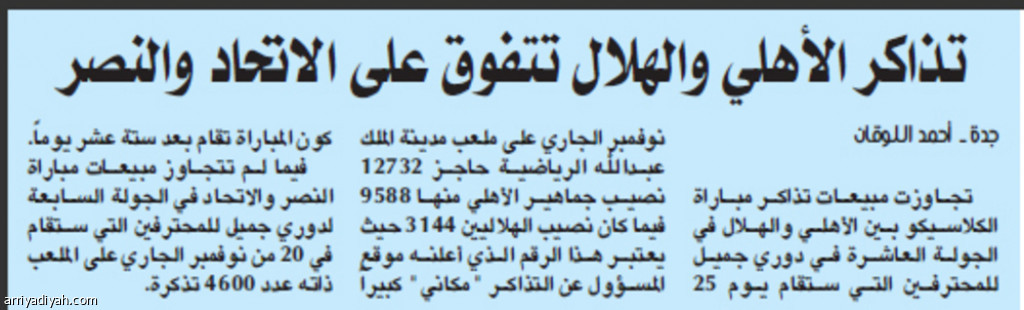 تجاوزت مبيعات تذاكر مباراة الكلاسيكو بين الأهلي والهلال في الجولة العاشرة في دوري جميل للمحترفين التي ستقام يوم 25 نوفمبر الجاري على ملعب مدينة الملك عبدالله الرياضية حاجز 12732 نصيب جماهير الأهلي منها 9588 فيما كان نصيب الهلاليين 3144 حيث يعتبر هذا الرقم الذي أعلنه موقع المسؤول عن التذاكر "مكاني" كبيراً كون المباراة تقام بعد ستة عشر يوماً.