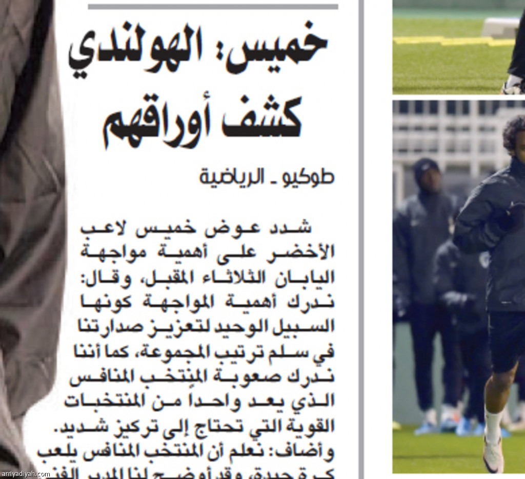 شدد عوض خميس لاعب الأخضر على أهمية مواجهة اليابان الثلاثاء المقبل، وقال: ندرك أهمية المواجهة كونها السبيل الوحيد لتعزيز صدارتنا في سلم ترتيب المجموعة، كما أننا ندرك صعوبة المنتخب المنافس الذي يعد واحداً من المنتخبات القوية التي تحتاج إلى تركيز شديد. وأضاف: نعلم أن المنتخب المنافس يلعب كرة جيدة، وقد أوضح لنا المدير الفني الكثير من النقاط الفنية الهامة التي يعتمد عليها المنتخب المنافس، سنعمل كل ما لدينا من أجل العودة إلى الوطن بالنقاط ومساعدتنا في تحقيق هدفنا.