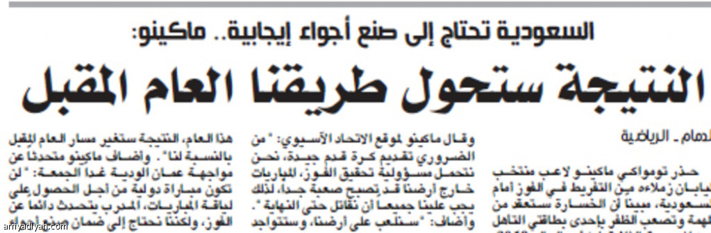 حذر تومواكي ماكينو لاعب منتخب اليابان زملاءه من التفريط في الفوز أمام السعودية، مبيناً أن الخسارة ستعقد من المهمة وتصعب الظفر بإحدى بطاقتي التأهل عن المجموعة الثانية لكأس العالم ٢٠١٨. وقال ماكينو لموقع الاتحاد الآسيوي: "من الضروري تقديم كرة قدم جيدة، نحن نتحمل مسؤولية تحقيق الفوز، المباريات خارج أرضنا قد تصبح صعبة جداً، لذلك يجب علينا جميعاً أن نقاتل حتى النهاية". وأضاف: "سنلعب على أرضنا، وستتواجد جماهير كثيرة، وهذه المباراة الأخيرة لنا هذا العام، النتيجة ستغير مسار العام المقبل بالنسبة لنا". وأضاف ماكينو متحدثاً عن مواجهة عمان الودية غداً الجمعة: "لن تكون مباراة دولية من أجل الحصول على لياقة المباريات، المدرب يتحدث دائماً عن الفوز، ولكننا نحتاج إلى ضمان صنع أجواء إيجابية قبل المباراة أمام السعودية".