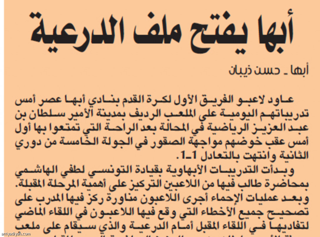 وبدأت التدريبات الأبهاوية بقيادة التونسي لطفي الهاشمي بمحاضرة طالب فيها من اللاعبين التركيز على أهمية المرحلة المقبلة. وبعد عمليات الإحماء أجرى اللاعبون مناورة ركز فيها المدرب على تصحيح جميع الأخطاء التي وقع فيها اللاعبون في اللقاء الماضي لتفاديها في اللقاء المقبل أمام الدرعية والذي سيقام على ملعب مدينة الأمير سلطان بن عبد العزيز الرياضية السبت المقبل.