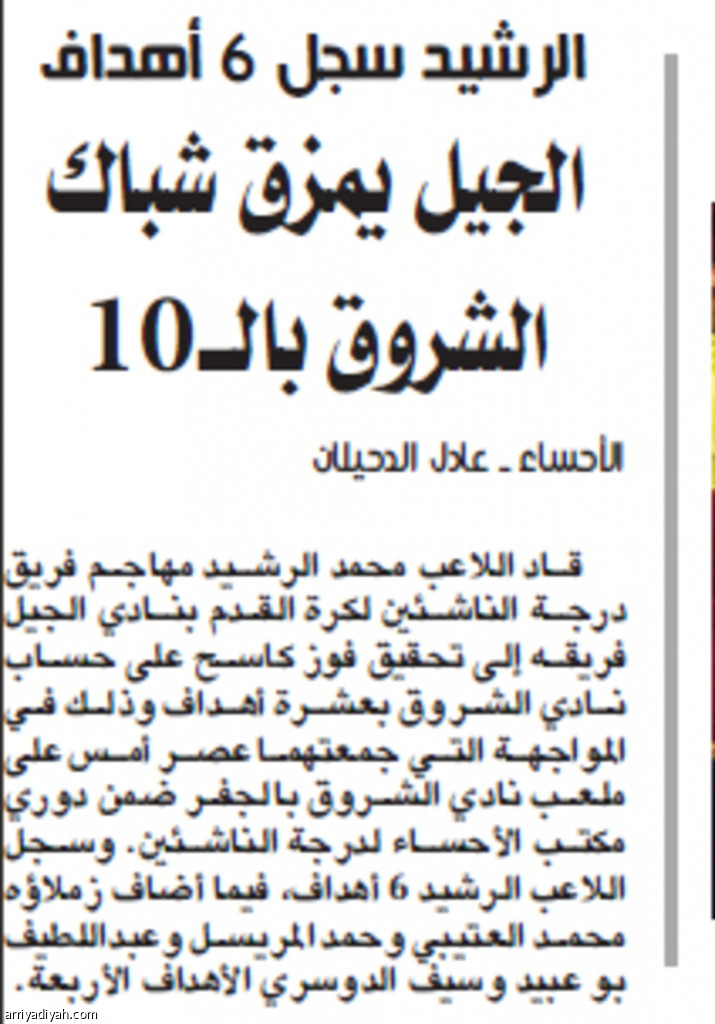 قاد اللاعب محمد الرشيد مهاجم فريق درجة الناشئين لكرة القدم بنادي الجيل فريقه إلى تحقيق فوز كاسح على حساب نادي الشروق بعشرة أهداف وذلك في المواجهة التي جمعتهما عصر أمس على ملعب نادي الشروق بالجفر ضمن دوري مكتب الأحساء لدرجة الناشئين. وسجل اللاعب الرشيد 6 أهداف، فيما أضاف زملاؤه محمد العتيبي وحمد المريسل وعبداللطيف بو عبيد وسيف الدوسري الأهداف الأربعة.