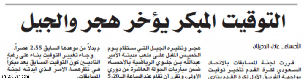 قررت لجنة المسابقات بالاتحاد السعودي لكرة القدم تأخير توقيت مواجهة الفريق الأول لكرة القدم بنادي هجر ونظيره الجيل التي ستقام يوم الخميس المقبل على ملعب مدينة الأمير عبدالله بن جلوي الرياضية بالأحساء ضمن مباريات الجولة العاشرة من دوري الأولى، وتقرر أن تقام عند الساعة الـ5,20 م بدلاً من موعدها السابق 2,55 عصراً.