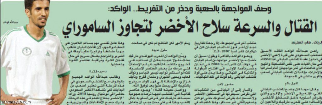 ويعود الواكد بالذاكرة ويقول: سبق أن خضت مع الأخضر مواجهتين أمام اليابان في نهائيات كأس آسيا 2000 في لبنان وخسرناهما، الأولى في افتتاح البطولة والثانية في النهائي، وهذا يدل على قوة المنتخب الياباني رغم قوتنا في تلك النهائيات.